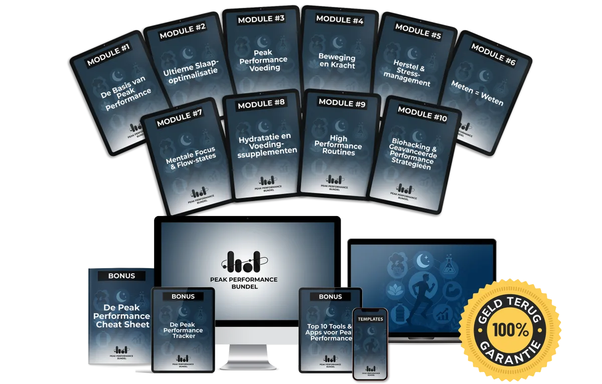 Je krijgt het complete Peak Performance systeem: Alle modules, tools, routines, strategieën, trackers en biohacks die je nodig hebt om jouw energie, herstel, focus en prestaties structureel te maximaliseren – op elk niveau.