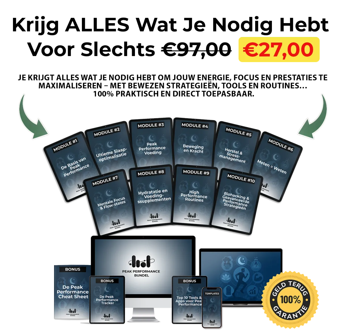 Normaal gesproken betaal je €97,00, maar in het kader van een tijdelijke promotiecampagne (om feedback en ervaringen te verzamelen), krijg je de volledige Peak Performance Bundel nu voor slechts €27,00. Let op: deze actie verdwijnt binnenkort. Profiteer dus zolang het nog kan.